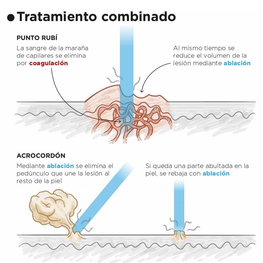 El láser vaporiza el tejido de la lesión, eliminándola de inmediato sin afectar la piel circundante.