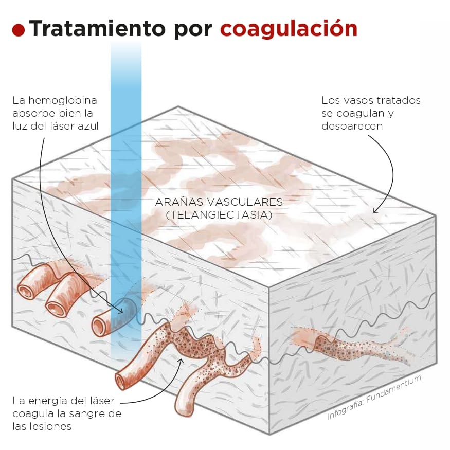 Fotocoagula la zona tratada, cerrando los vasos sanguíneos para que desaparezcan sin dejar marcas.
